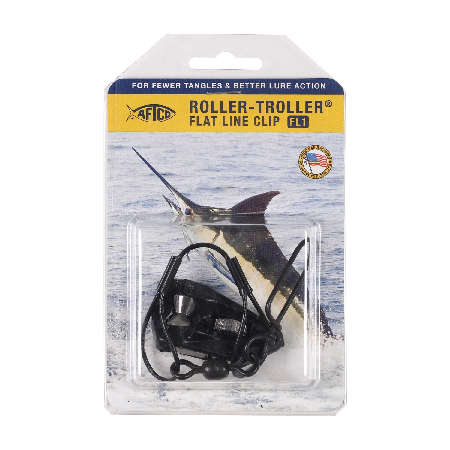 AFTCO Flat Line Fishing Clip put lines trolled from the stern of the boat into the water at a lower angle to minimize tangling and keep your lures below the surface for better action and when a fish strikes, you’ll know at the instant the clip snaps open to release the line. The Flat Line Clip is fitted with a 135-lb. coated stainless steel cable and a heavy duty snap swivel.
