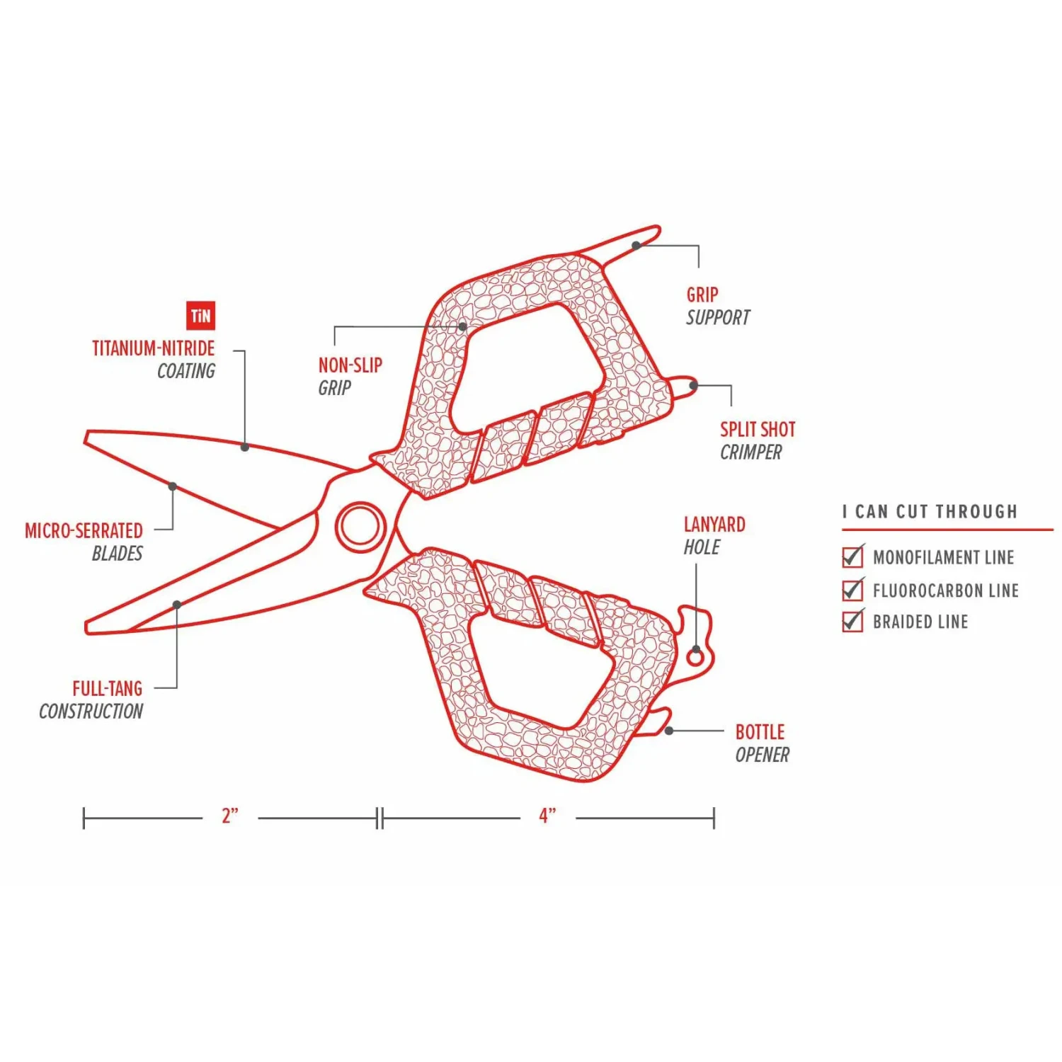 The Bubba Small Shears are multi-functional, lightweight and durable. They are engineered to cut monofilament, fluorocarbon or braided line with ease. The Small Shears are also equipped with our iconic, non-slip grip handles, a split shot crimp tool, bottle opener and lanyard hole. Although they may be small, these shears sure are mighty.