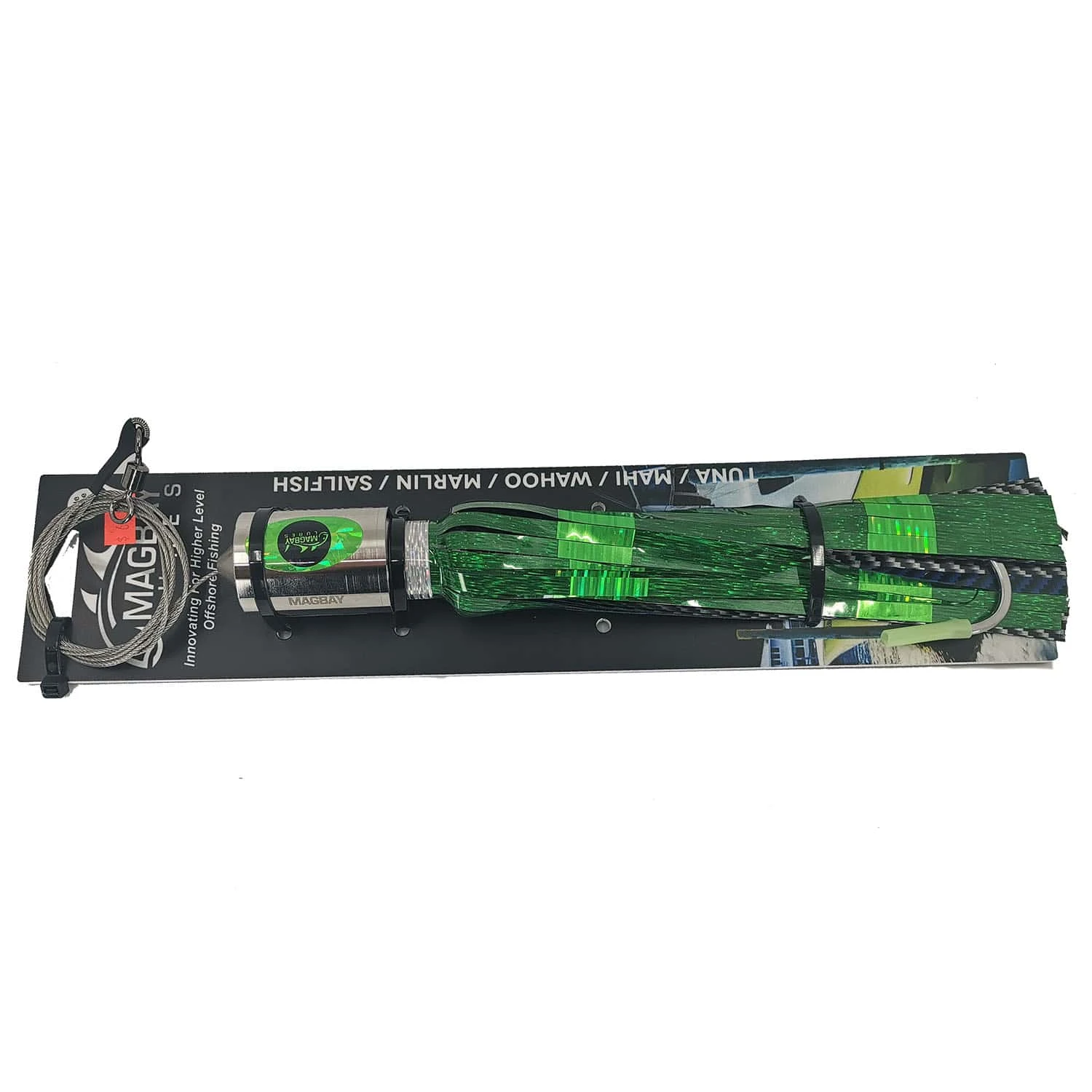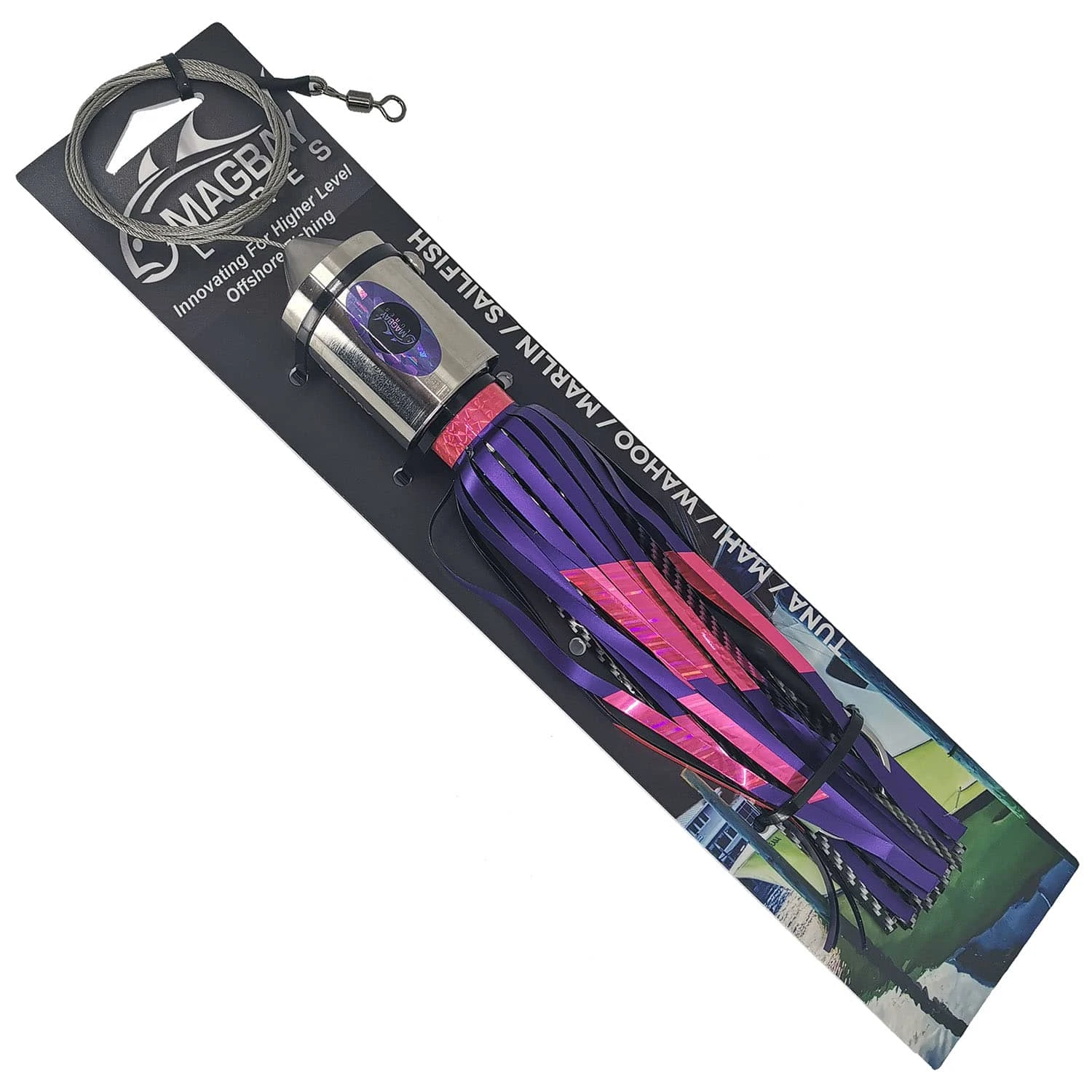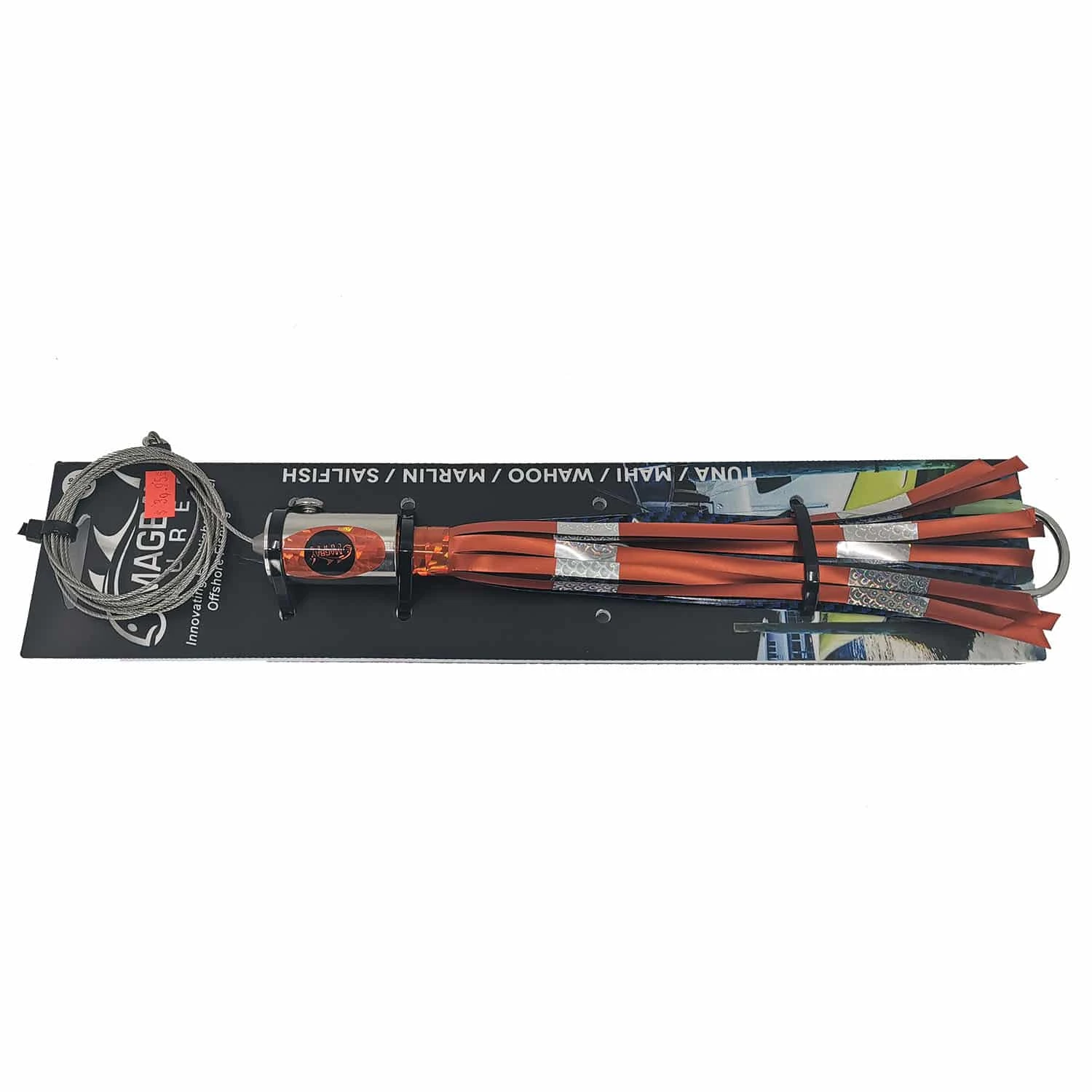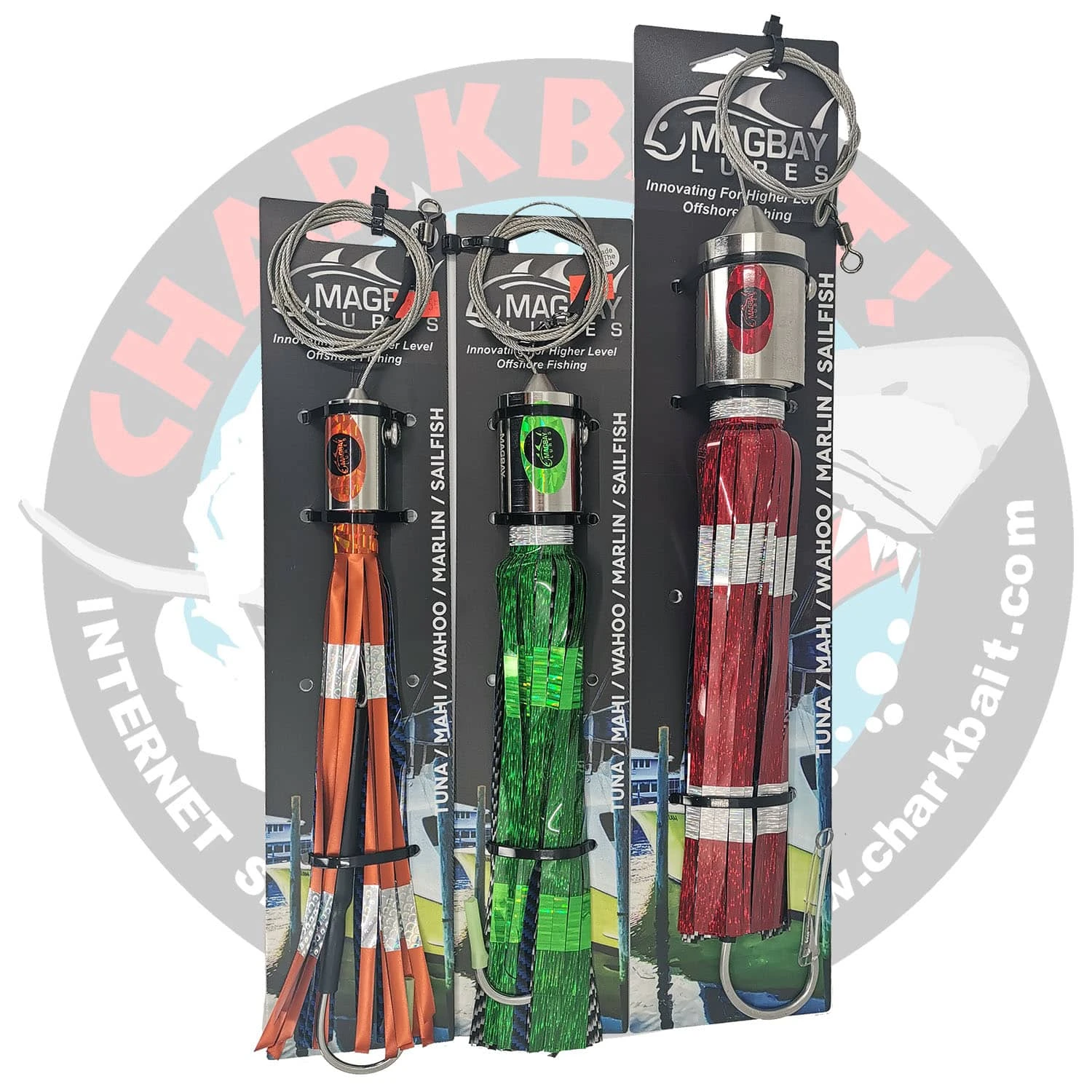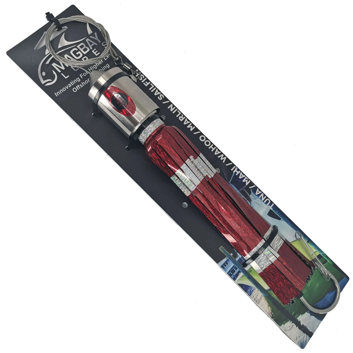 Some more very nice options for wahoo trollers. MagBay made a very good name for themselves by way of the MagTrak trolling lures. Very effective lures, run true in a wide range of conditions at speed. They are a very good option when fishing aboard one of the long range boats heading down to the Ridge or Alijos Rocks in search of wahoo. While Nomad’s DTX Minnows have gained a deservedly good following over the past few years, they are far more speed dependent and will not run well unless the boat’s skipper gives some consideration to boat speed and conditions. In many instances, the DTX’s won’t run well tight on the corners of the boat, only on the middle lines which are further back. That’s where the MagTrack and the new El Sincero come into play. The Rigged El Sincero Wahoo trolling lures are made for speed, and made to be noticed. These lures are made from STAINLESS STEEL, and feature an easy to use skirting mechanism for ease in replacing the tinsel and underskirt. They will run well in any position on the boat, straight, true, and they will draw strikes. The head of the lure is “open faced” which helps the lure run well at very high speeds, creates a bubble trail and noise to draw fish into the spread. They will HELP ALL OTHER LURES IN THE SPREAD get noticed. That is a big plus for these noisy lures. The lures are pre-rigged on 400# cable with stainless steel hooks of appropriate size (9/0 for 16 and 32 oz lures and 8/0 for the smaller 8 ounce lure).