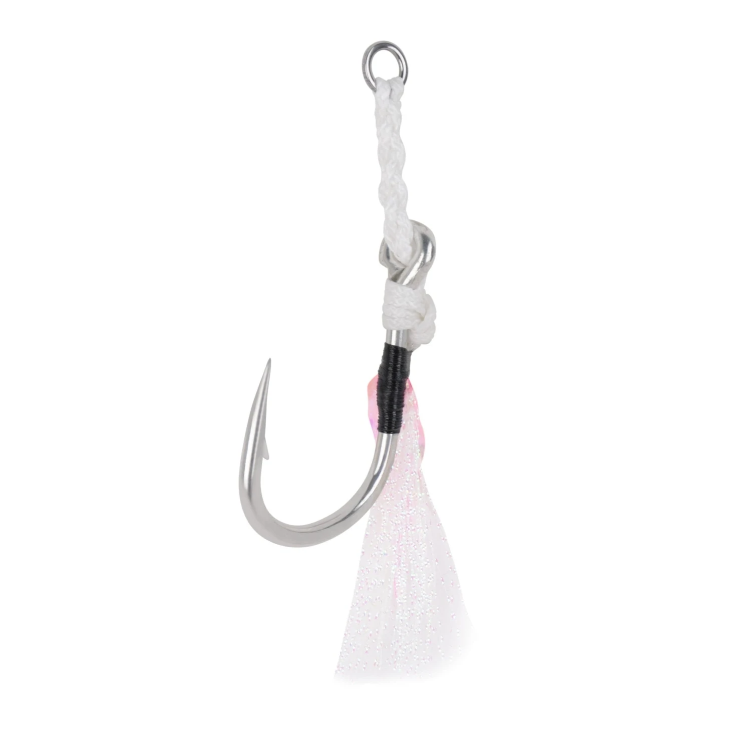 The J-Assist2 hooks offer an upgrade over the J-Assist1, they feature a double woven braid leader instead of a single piece of braid which gives you a lot more abrasion resistance. Each hook in the pack comes with its own ring which makes it great if you wanted to put a hook on each side, otherwise you can put the two together and crimp a leader to both rings to make sure you’ve got a solid connection instead of relying on a split ring. These hooks come with the white & glow flash which is perfect for glow colored jigs, the flash mimics squid tentacles and gives you more bites on the big fish.
