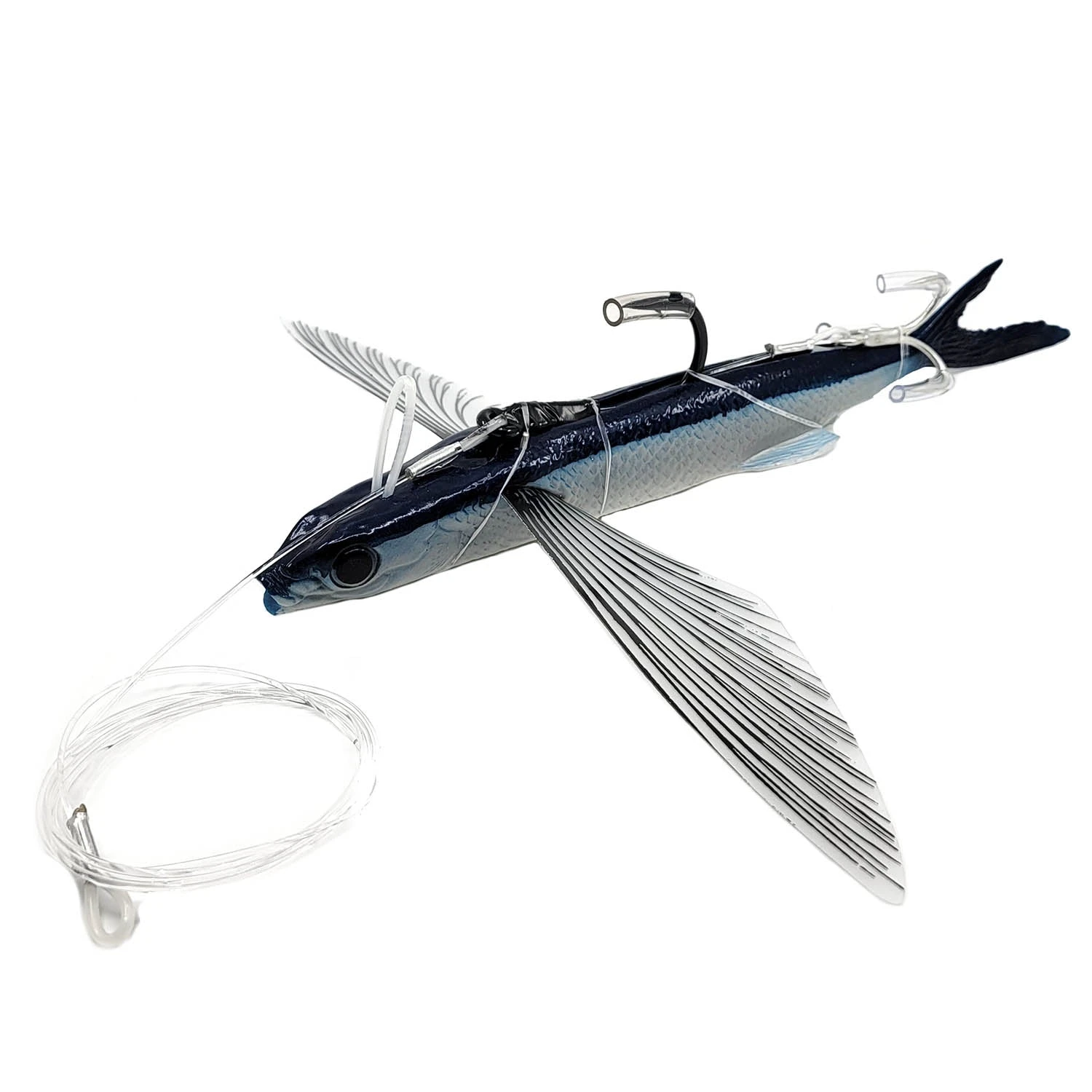 Each lure includes 4 sets of wings, or 8 total which is great because they are actually reversible so they work on both sides unlike some of the competition. They also include a pre-crimped leader and hook setup so you don’t have to waste time doing it yourself, the leader is very heavy and they use the best hooks available on the market a large Owner Jobu single and an ST-76 5X treble hook. Along with this you get a ton of rubber bands to attach the rig to your flying fish and a set of instructions.