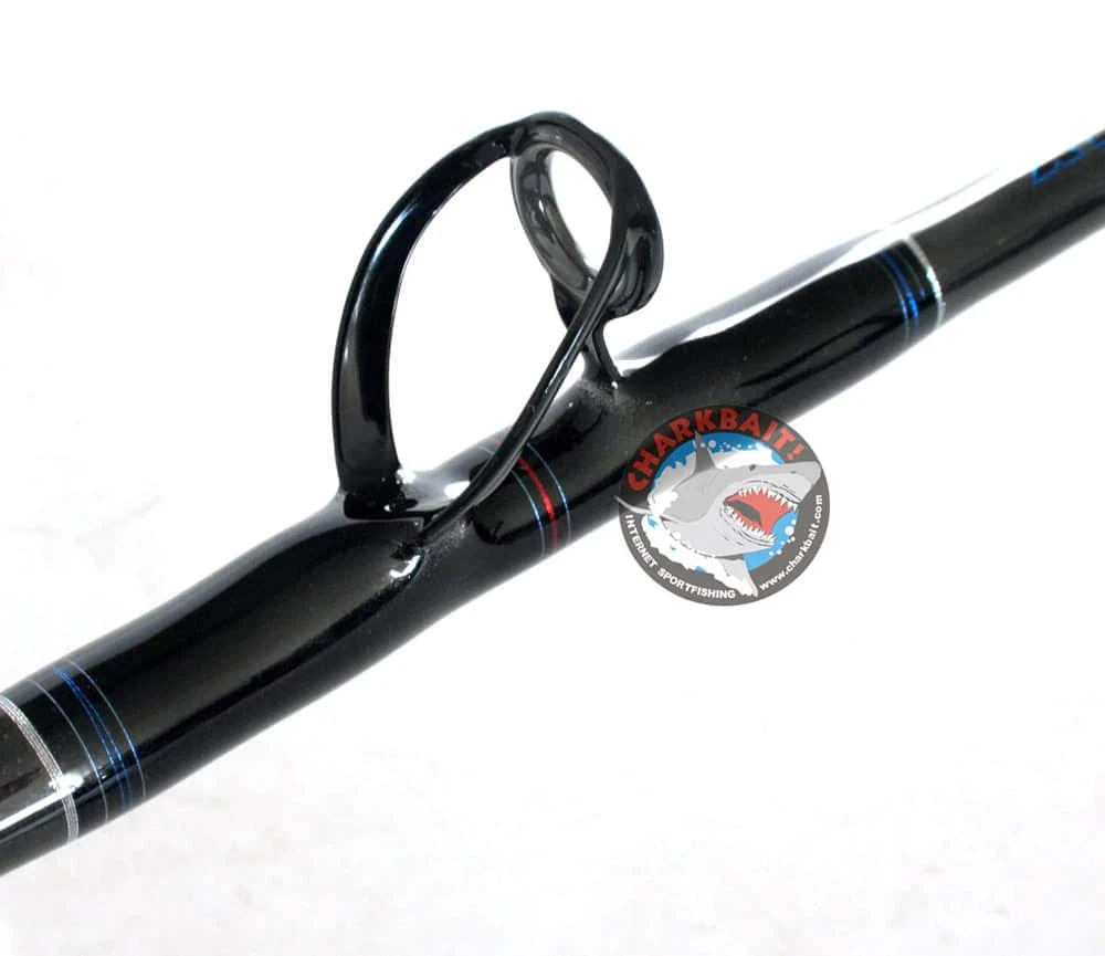 7 and 7 1/2 foot length, it wasn’t long ago that we considered anything longer than 6 feet impractical for cow fishing. But times have changed and rod designs have progressed. The length is related to the manner of fishing, use of the rail as a fulcrum. In general, while a longer rod usually has better casting properties for distance, that’s not the rational for these rods. They are made to fish the rail, especially as you get into the vertical game on a big fish. The longer rods are more suited to the bigger boats, boats with wider rails like the Excel, RP and Rooster. The shorter 7 footers will load up better on the smaller boats, like the American Angler. Having said that, there’s another distinction between the two lengths, the longer rods have more material in ’em, the butts are larger diameter which requires more material in their build. The 7 1/2 footers can fish the heavier recommended lines, while the 7 footers will load up better at the lighter drag settings. For example a Raptor at 7 feet does best at 60# and 20-22 lbs of drag while the 7 1/2 footer will fish 80# with say 24-25 lbs drag. You have a bit more leverage in a standoff at distance with the shorter rod, and more lift at vertical on a bigger boat with the longer rod.